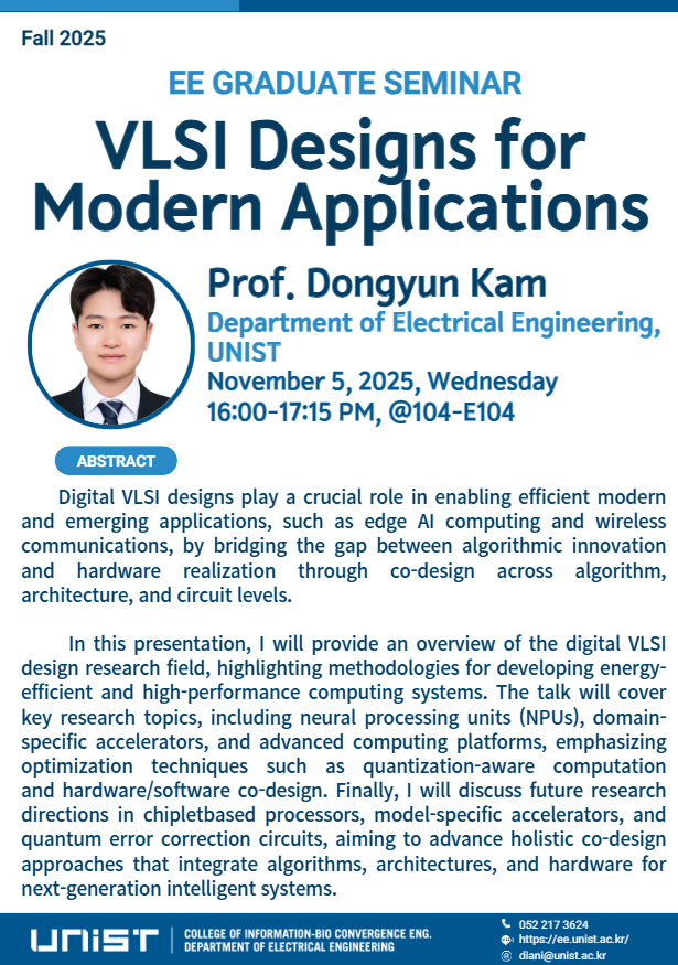 EE Graduate Seminar(VLSI Designs for Modern Applications) 2025.11.03 Date 2025-11-05 (16:00 ~ 17:15) Location Building 104, E104 Speaker Dongyun Kam (UNIST)